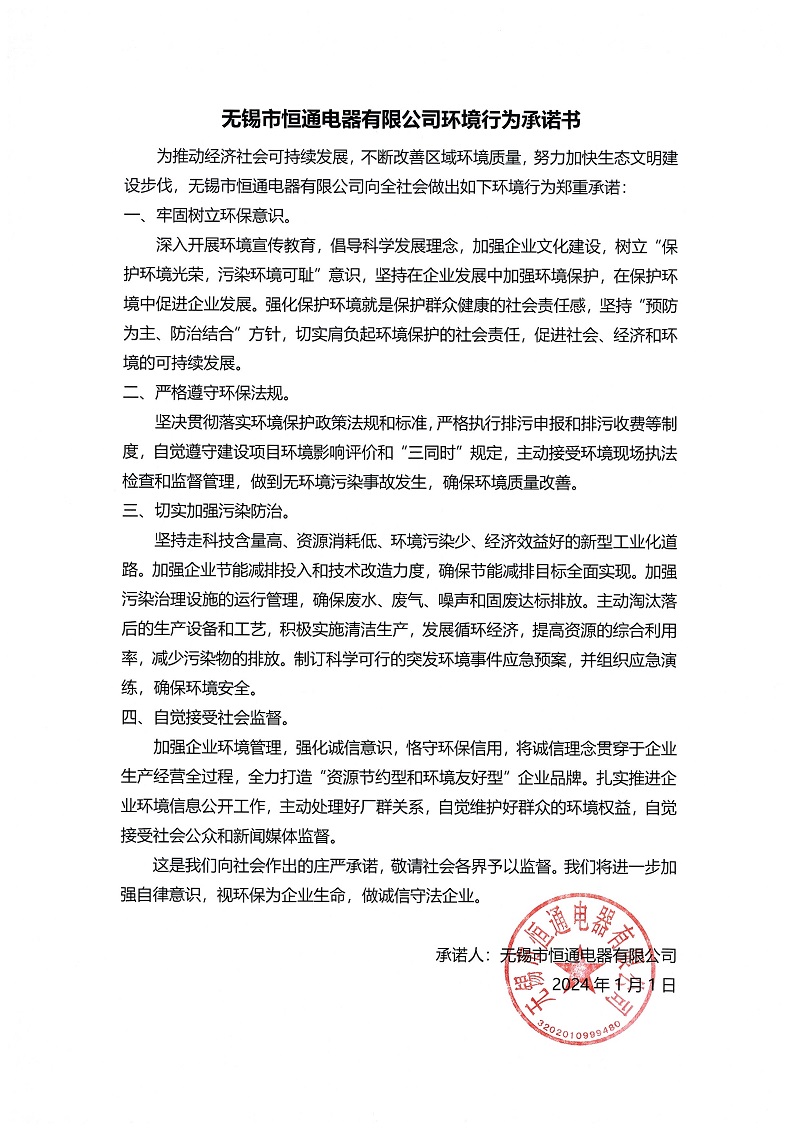 無錫市恒通電器有限公司環(huán)境行為承諾書